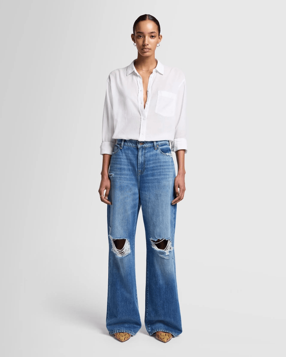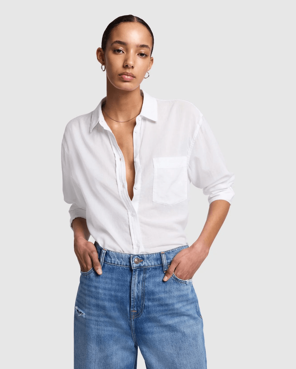 Elevate your wardrobe with the 7 For All Mankind Classic Button Up Shirt in White, a chic and feminine twist on the traditional button-up. This shirt combines sophistication with effortless style, making it an essential piece for any fashion-forward woman.