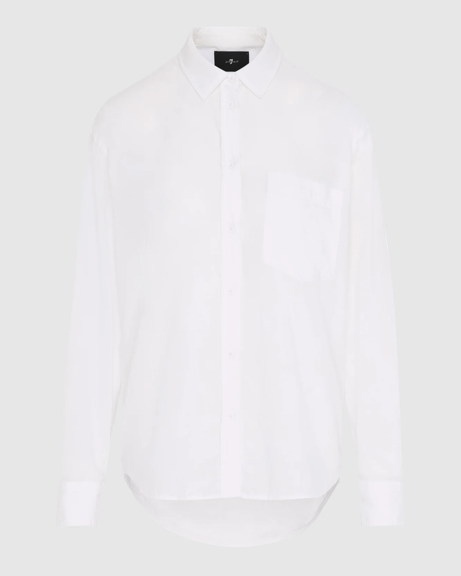 The 7 For All Mankind Classic Button Up Shirt in White features a slightly dropped shoulder design that enhances its relaxed silhouette. The collared button-down style offers a refined touch, making it suitable for both casual outings and professional settings. Its slightly sheer fabric adds a layer of sophistication, allowing you to effortlessly transition from day to night.