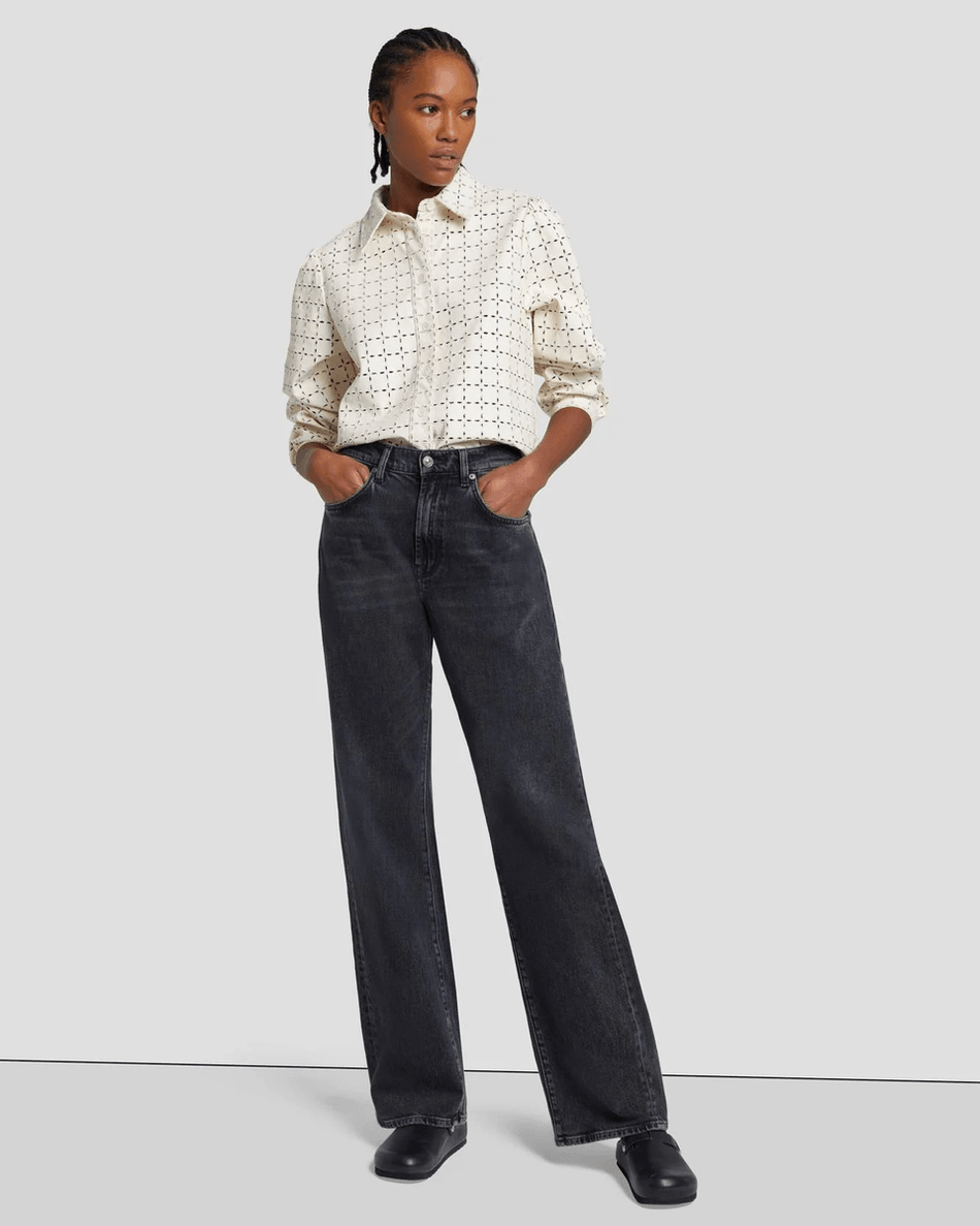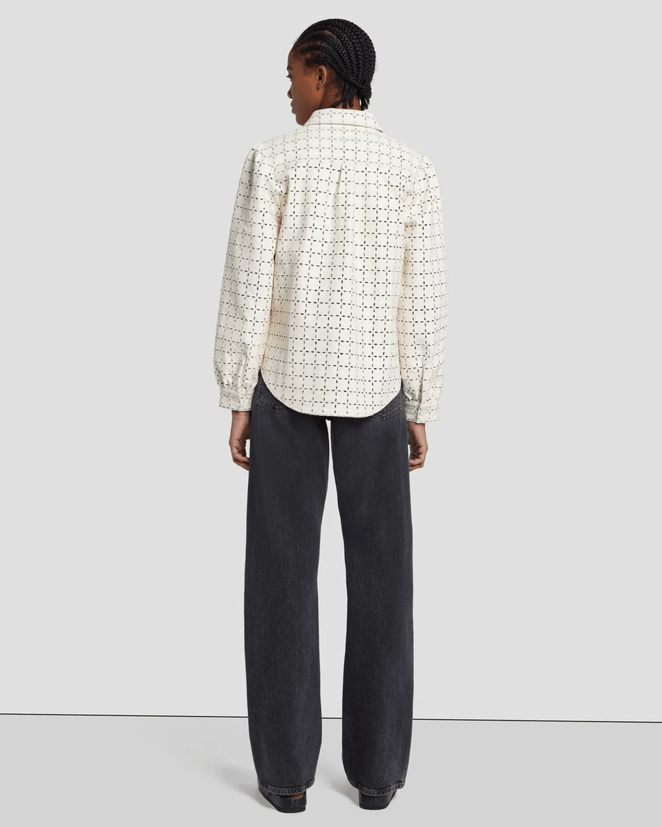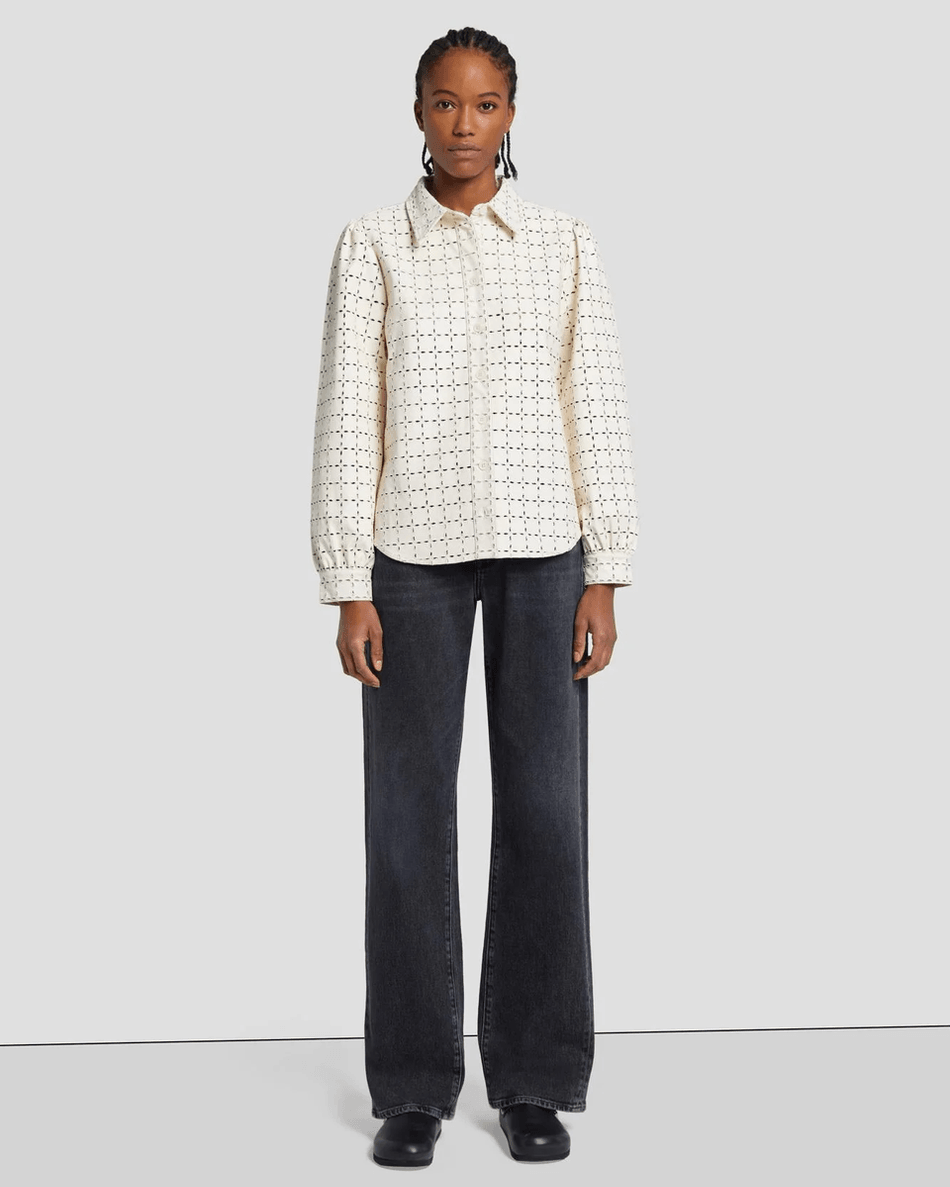 Discover the perfect blend of sophistication and everyday comfort with the 7 For All Mankind Faux Leather Eyelet Classic Shirt in Cream. This chic blouse transforms your wardrobe with its unique faux leather design and intricate eyelet detailing, making it a must-have for any fashion-forward individual.