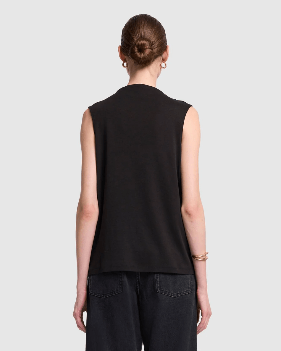 Discover the perfect blend of style and comfort with the 7 For All Mankind High Neck Draped Top in Black. This sleeveless top features a chic high neck design that effortlessly flatters your silhouette. Crafted from soft, lightweight cotton, it ensures you stay comfortable while looking fashionable.