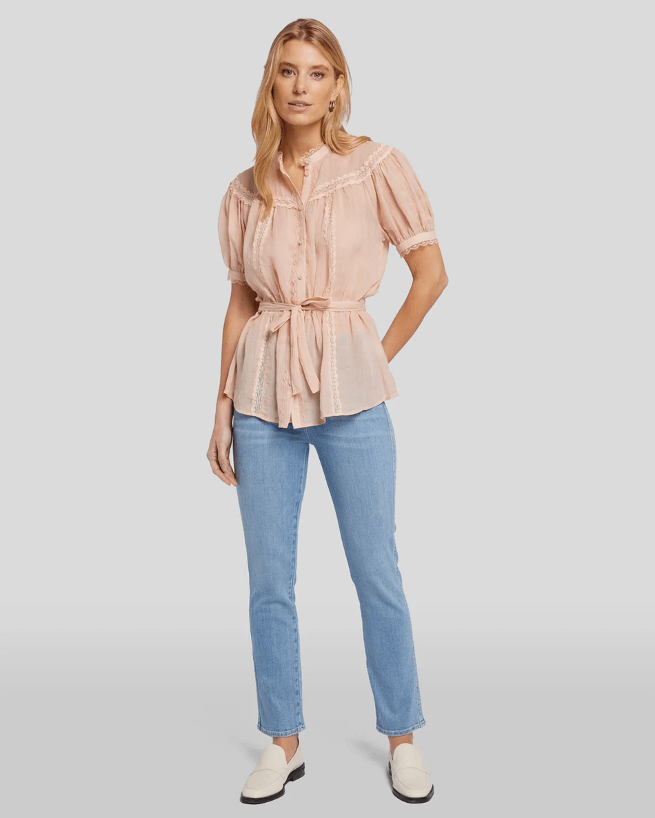 Don’t miss out on adding this stunning piece to your collection! Shop the 7 For All Mankind Lace Trim Prairie Blouse in Spanish Villa today and redefine your style.