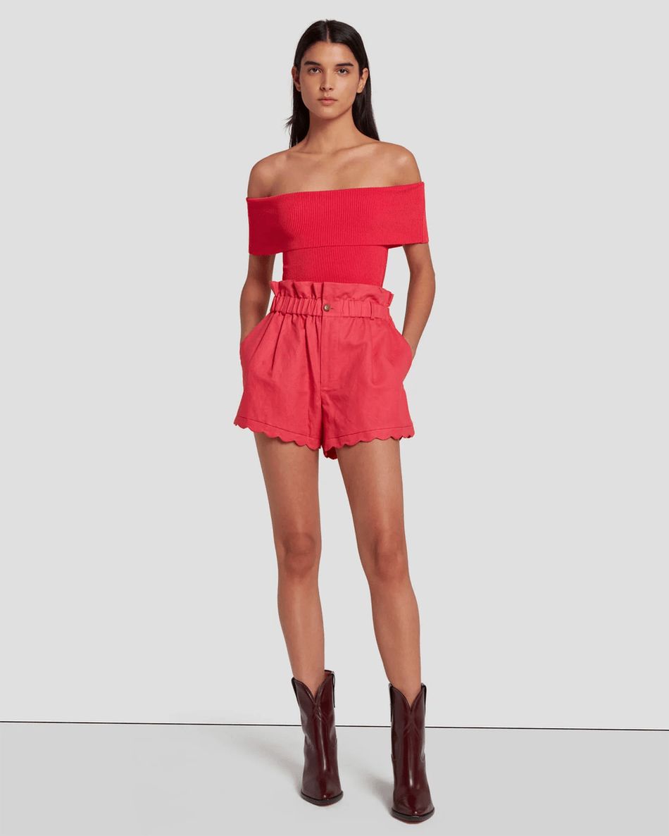 Make a bold statement with the 7 For All Mankind Off The Shoulder Ribbed Top in Geranium. This stunning top features a classic off-the-shoulder design that flatters every figure. Crafted from a premium compact ribbed knit, it combines style and comfort effortlessly.