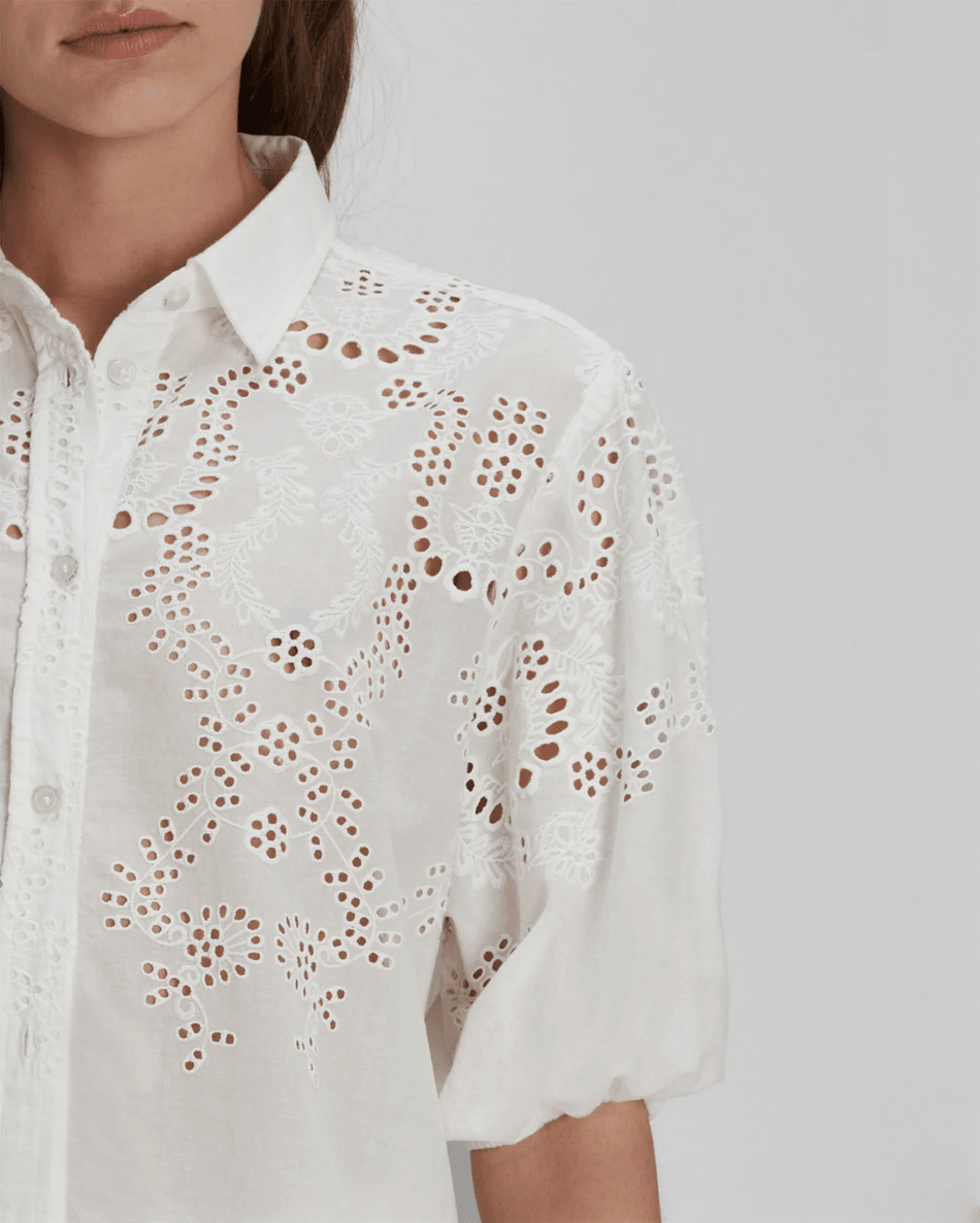 Discover the perfect blend of elegance and comfort with the 7 For All Mankind Puff Sleeve Tunic In White White. This stunning tunic features voluminous puff sleeves and intricate eyelet detailing, transforming a casual button-front design into a chic outfit essential.