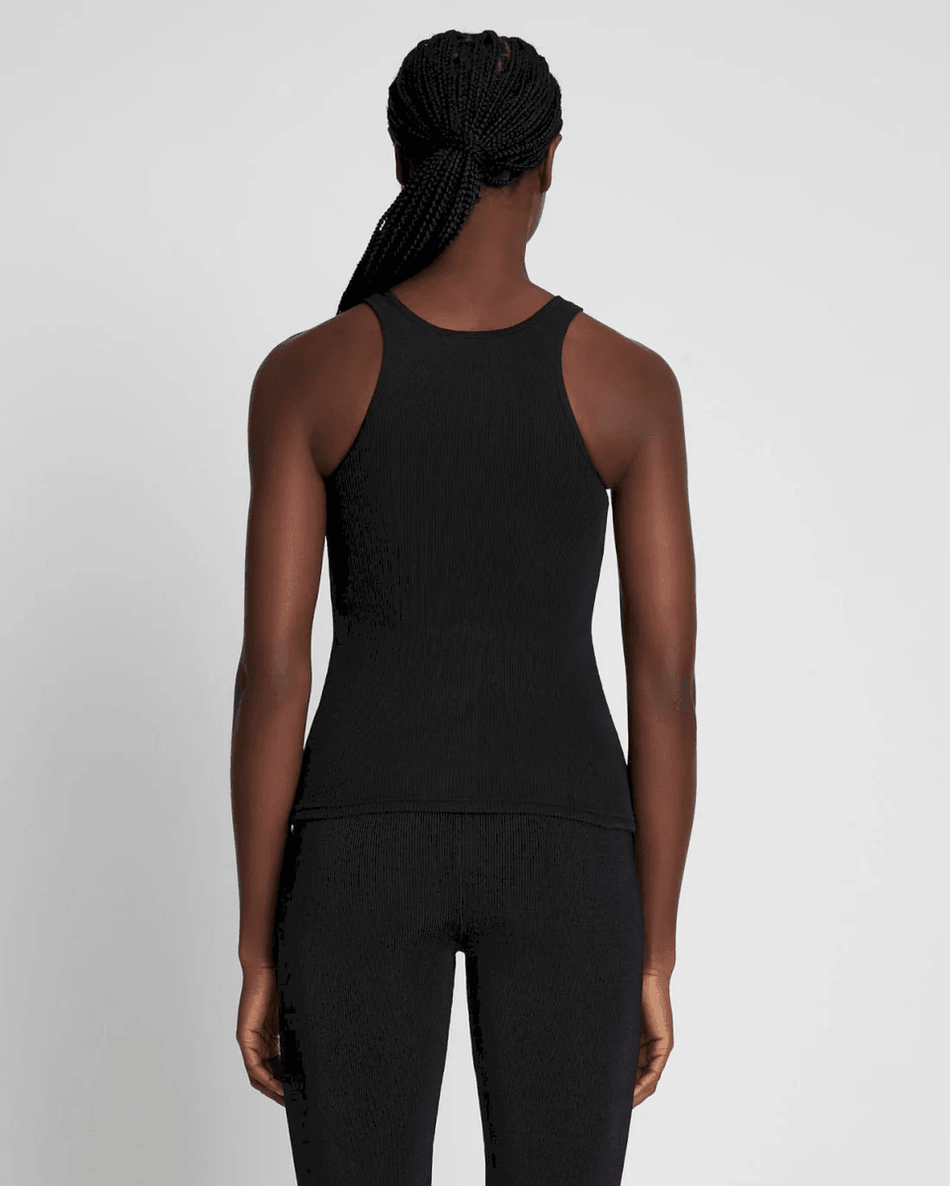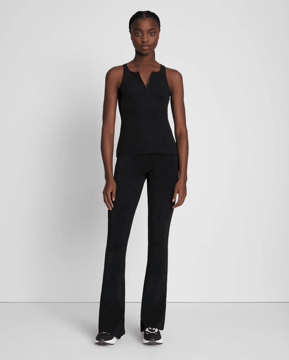 Elevate your wardrobe with the 7 For All Mankind Quarter Zip Ribbed Tank in Moonless Night. This fitted racerback tank is crafted from a premium compact ribbed knit, making it an essential layering piece for every fashion-forward individual.