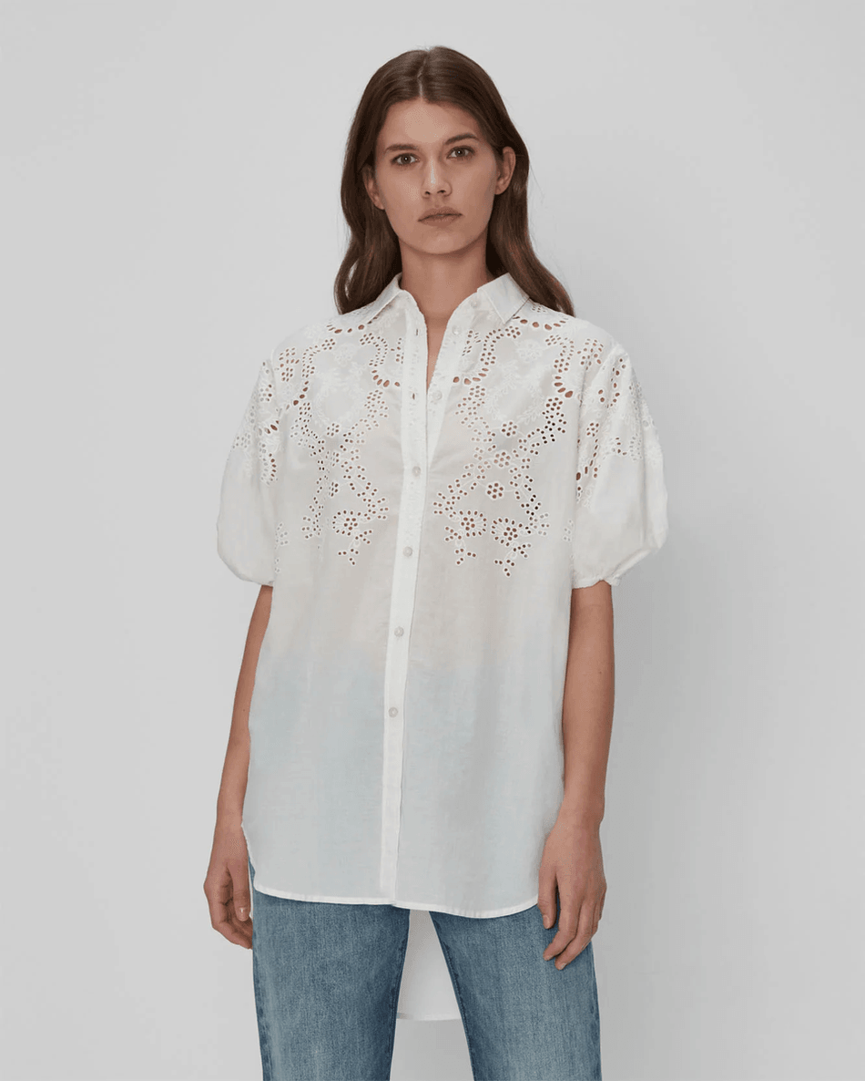 The 7 For All Mankind Soft Volume Lace Top in Black is crafted with intricate eyelet lace, providing a chic yet breathable feel. The shirred neckline and ruffle trim puff sleeves create a romantic silhouette, perfect for pairing with your favorite loose-fitting, destroyed denim. Whether you're heading out for brunch or a casual evening, this versatile top adds a sweet finish to your look.
